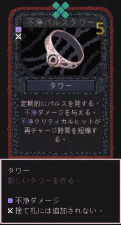 また、前述した不浄クリティカルもレアリティが高いほど効果があるので、エースが上のカードでアップグレードすると、不浄パルスタワー+クリティカル構成をより早く実現できます。