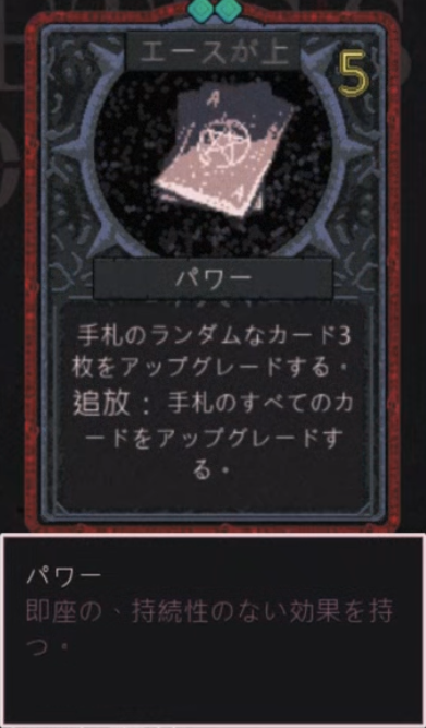ランダム要素はありますが、本作は手札の数が少ないため、比較的狙ってカードをアップグレードでき、序盤で手に入ると協力。