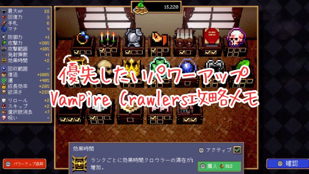 ただ、クロウラー クロチ・フリートを使えば復活が最初から付いていることと、ダンジョンの早い段階でHPが0になるようならば、そもそも他のパワーアップをしないとダンジョン攻略が難しいため。