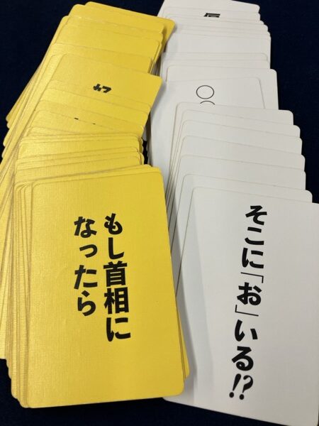 お題を出す人が、ボケを考えて、他のプレイヤーがツッコミにあたるカードを取るというゲーム。